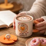 Yüksek kaliteli porselenden üretilen bu kupa, sevimli donut motifli tasarımı ve silikon donut figürlü kapağıyla öne çıkar.